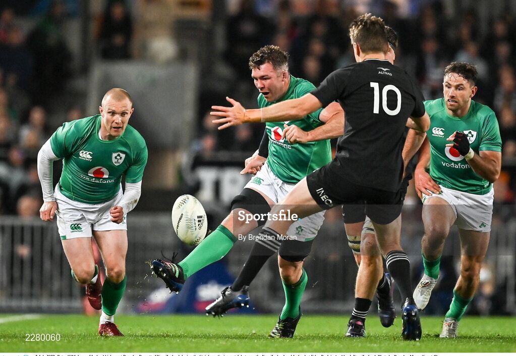 2 July 2022; Peter O’Mahony of Ireland kicks past Beauden Barrett of New Zealand during the Steinlager Series match between the New Zealand and Ireland at Eden Park in Auckland, New Zealand. Photo by Brendan Moran/Sportsfile