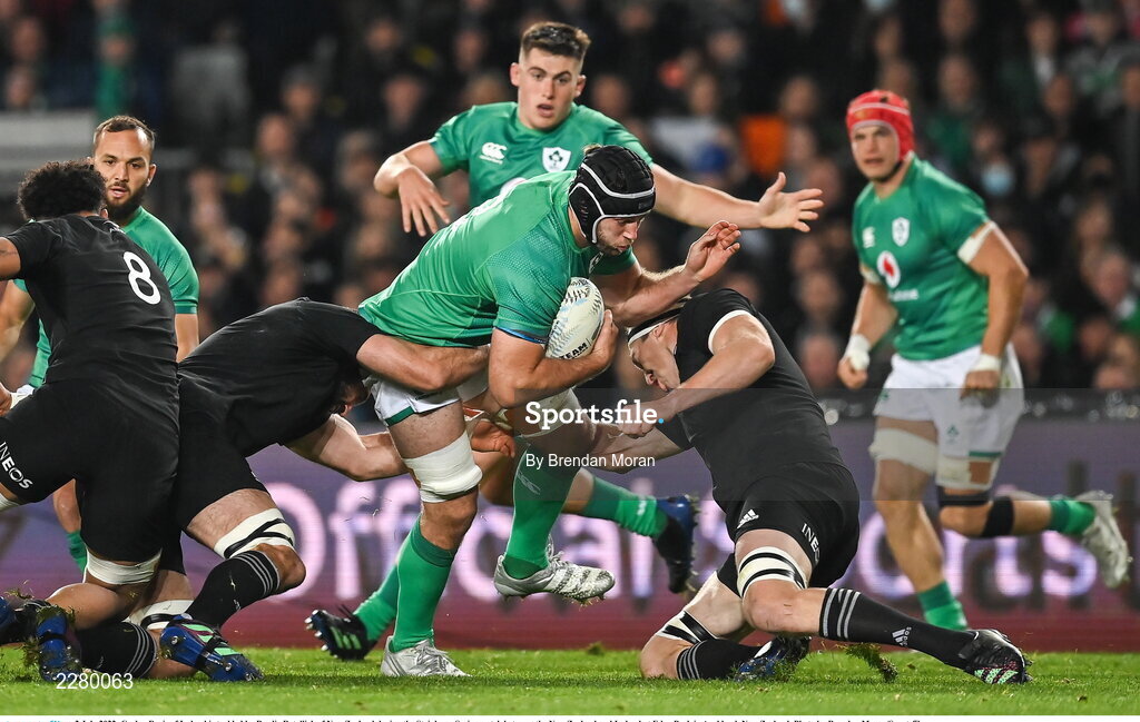 2 July 2022; Caelan Doris of Ireland is tackled by Brodie Retallick of New Zealand during the Steinlager Series match between the New Zealand and Ireland at Eden Park in Auckland, New Zealand. Photo by Brendan Moran/Sportsfile