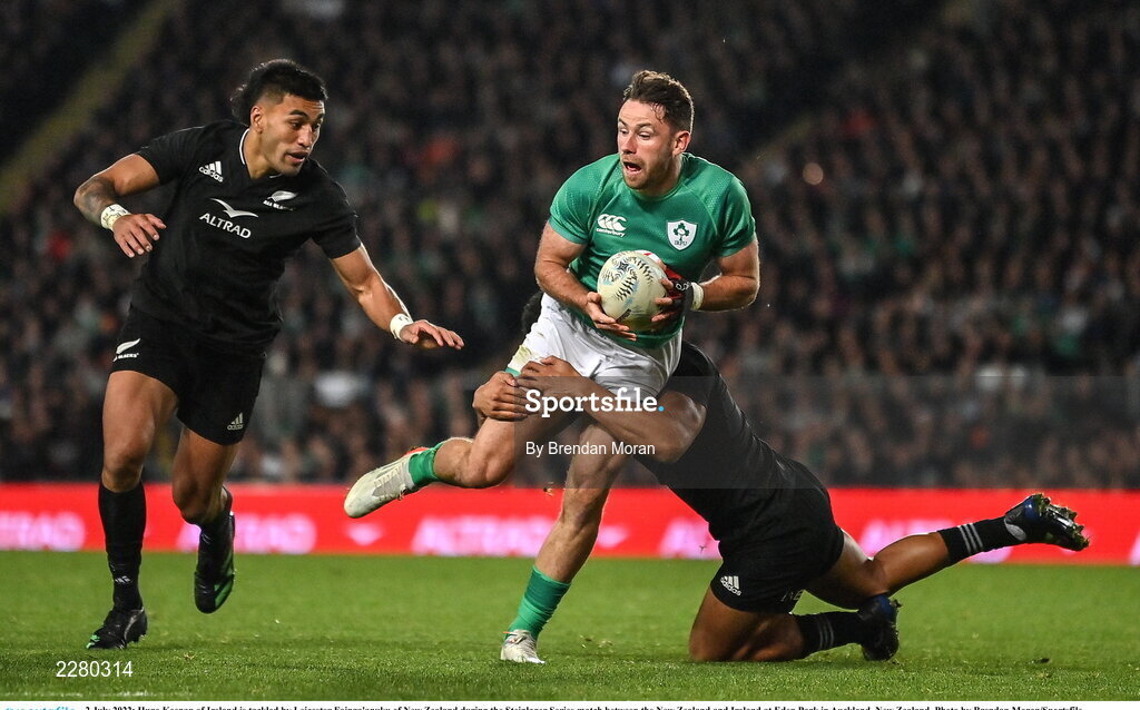 2 July 2022; Hugo Keenan of Ireland is tackled by Leicester Fainga'anuku of New Zealand during the Steinlager Series match between the New Zealand and Ireland at Eden Park in Auckland, New Zealand. Photo by Brendan Moran/Sportsfile