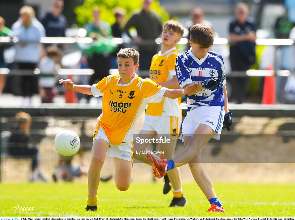 2 July 2022; Patrick Small of Blessington, Co Wicklow, in action against Jack Brady of Clontibert, Co Monaghan, during the Shield Semi-Final between Blessington, Co Wicklow, and Clontibert, Co Monaghan, at the John West National Football Feile 2022 event at Kildare GAA Centre in Hawkfield, Kildare. Photo by Matt Browne/Sportsfile