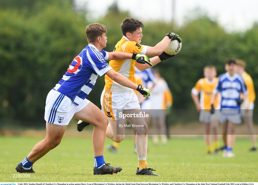 2 July 2022; Stephen Hamill of Clontibert Co Monaghan in action against Harry Lyon of Blessington Co Wicklow, during the Shield Semi-Final between Blessington Co Wicklow and Clontibert Co Monaghan at the John West National Football Feile 2022 event at Kildare GAA Centre in Hawkfield, Kildare. Photo by Matt Browne/Sportsfile