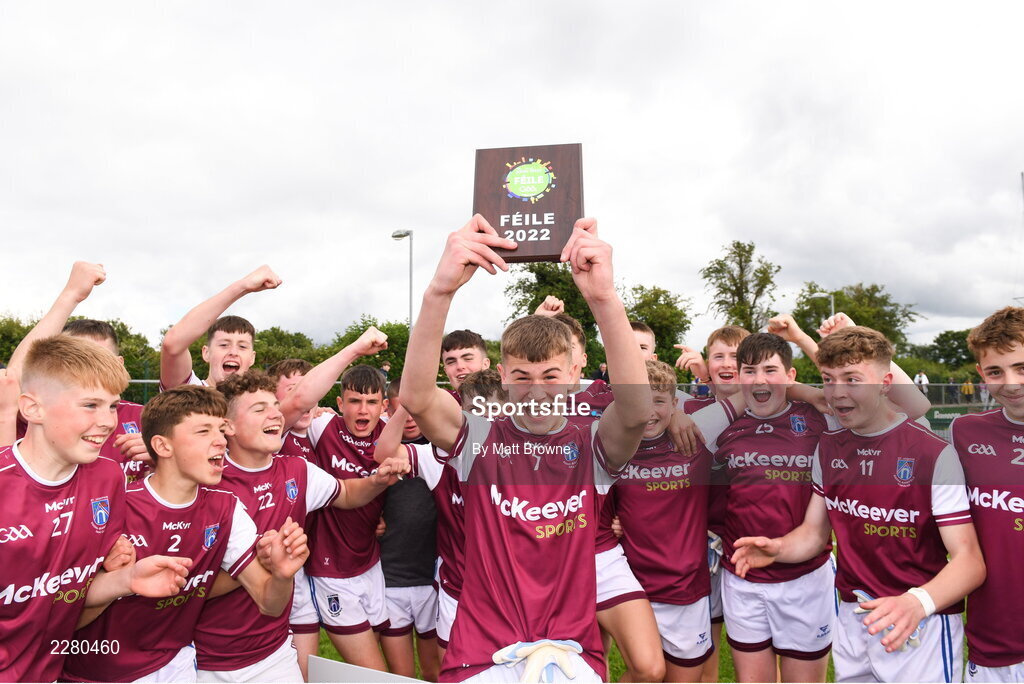 2 July 2022; Liam Clune captain of St. Joseph's Doore Barefield Co Clare lifts the shield as his team-mates celebrate after the Shield Final between St. Joseph's Doore Barefield Co Clare and Blessington Co Wicklow at the John West National Football Feile 2022 event at Kildare GAA Centre in Hawkfield, Kildare. Photo by Matt Browne/Sportsfile