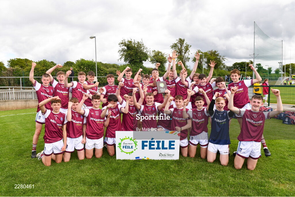 2 July 2022; St. Joseph's Doore Barefield Co Clare celebrate after the Shield Final between St. Joseph's Doore Barefield Co Clare and Blessington Co Wicklow at the John West National Football Feile 2022 event at Kildare GAA Centre in Hawkfield, Kildare. Photo by Matt Browne/Sportsfile