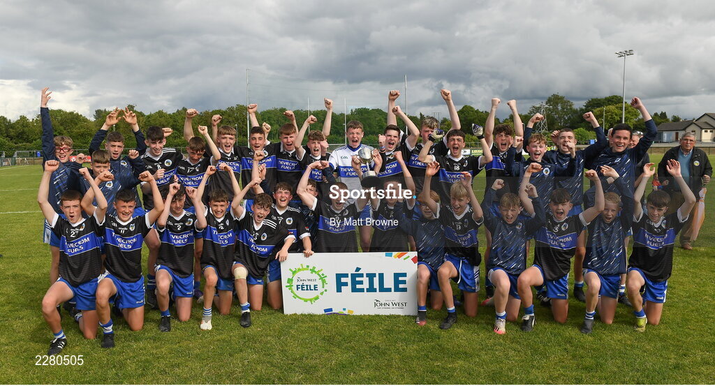2 July 2022; The St Patrick's Dromintee Co Armagh players celebrate with the cup after the Cup Final match between St Patrick's Dromintee Co Armagh and Durlas Og Co Tipperary at the John West National Football Feile 2022 event at Kildare GAA Centre in Hawkfield, Kildare. Photo by Matt Browne/Sportsfile