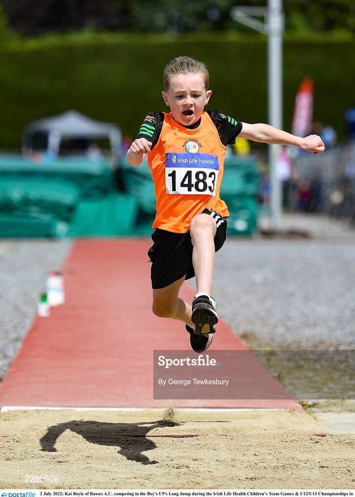 2 July 2022; Kai Boyle of Rosses A.C. competing in the Boy's U9's Long Jump during the Irish Life Health Children’s Team Games & U12/U13 Championships in Tullamore, Offaly. Photo by George Tewkesbury/Sportsfile