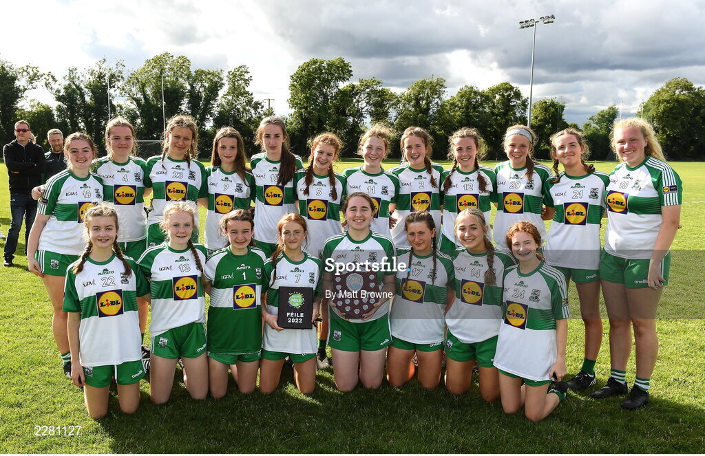 2 July 2022; Aoife Morris captain of Portlaois Co Laois lifts the shield as her team-mates celebrate after the Shield Final between Portlaois Co Laois and Blessington Co Wicklow at the John West National Football Feile 2022 event at Kildare GAA Centre in Hawkfield, Kildare. Photo by Matt Browne/Sportsfile