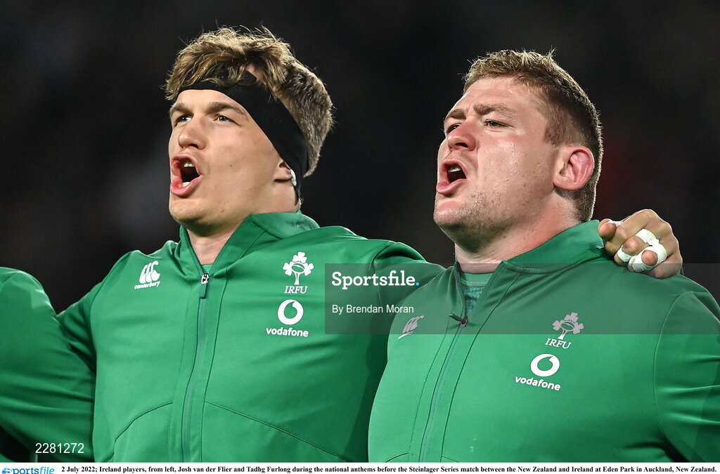 2 July 2022; Ireland players, from left, Josh van der Flier and Tadhg Furlong during the national anthems before the Steinlager Series match between the New Zealand and Ireland at Eden Park in Auckland, New Zealand. Photo by Brendan Moran/Sportsfile