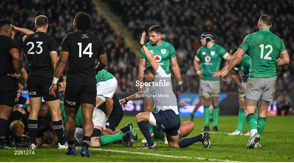 2 July 2022; Referee Karl Dickson signals for a try to Ireland, scored by Josh van der Flier (hidden),during the Steinlager Series match between the New Zealand and Ireland at Eden Park in Auckland, New Zealand. Photo by Brendan Moran/Sportsfile