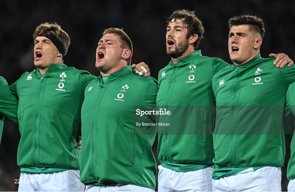 2 July 2022; Ireland players, from left, Josh van der Flier, Tadhg Furlong, Caelan Doris and Dan Sheehan during the national anthems before the Steinlager Series match between the New Zealand and Ireland at Eden Park in Auckland, New Zealand. Photo by Brendan Moran/Sportsfile