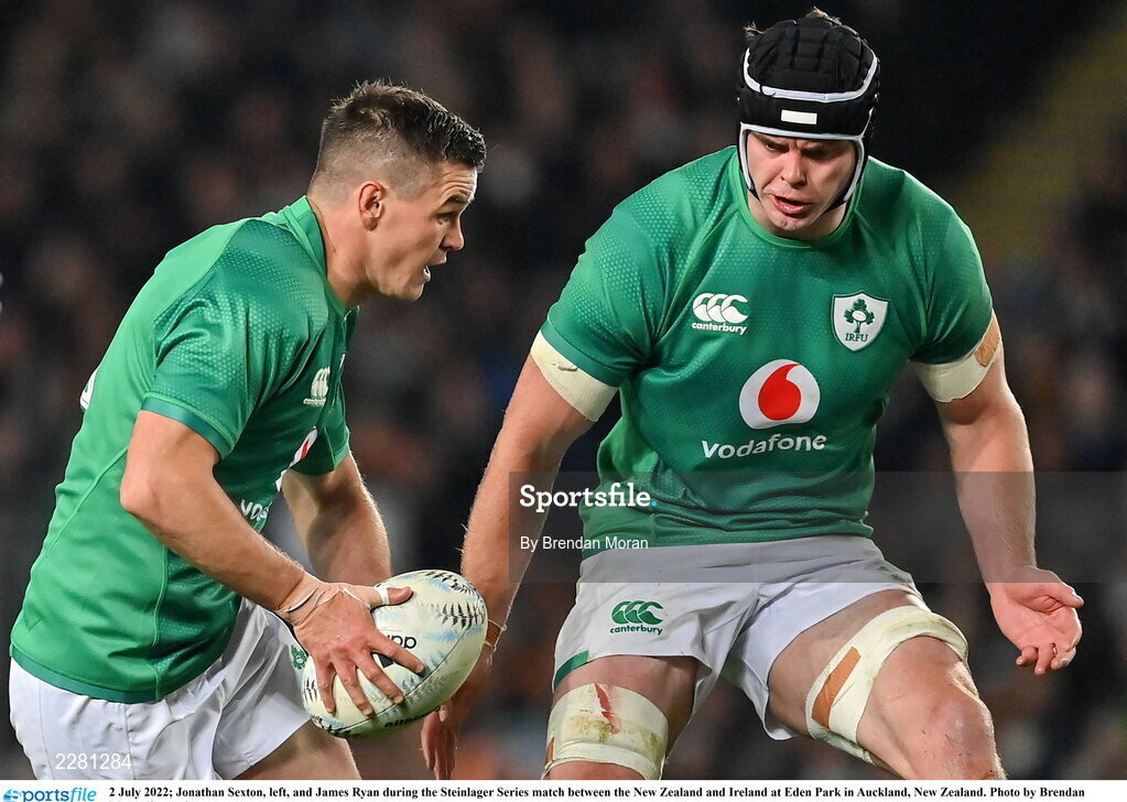 2 July 2022; Jonathan Sexton, left, and James Ryan during the Steinlager Series match between the New Zealand and Ireland at Eden Park in Auckland, New Zealand. Photo by Brendan Moran/Sportsfile