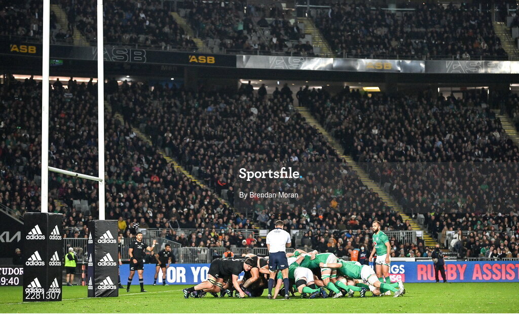 2 July 2022; The Ireland and New Zaland packs scrum down during the Steinlager Series match between the New Zealand and Ireland at Eden Park in Auckland, New Zealand. Photo by Brendan Moran/Sportsfile