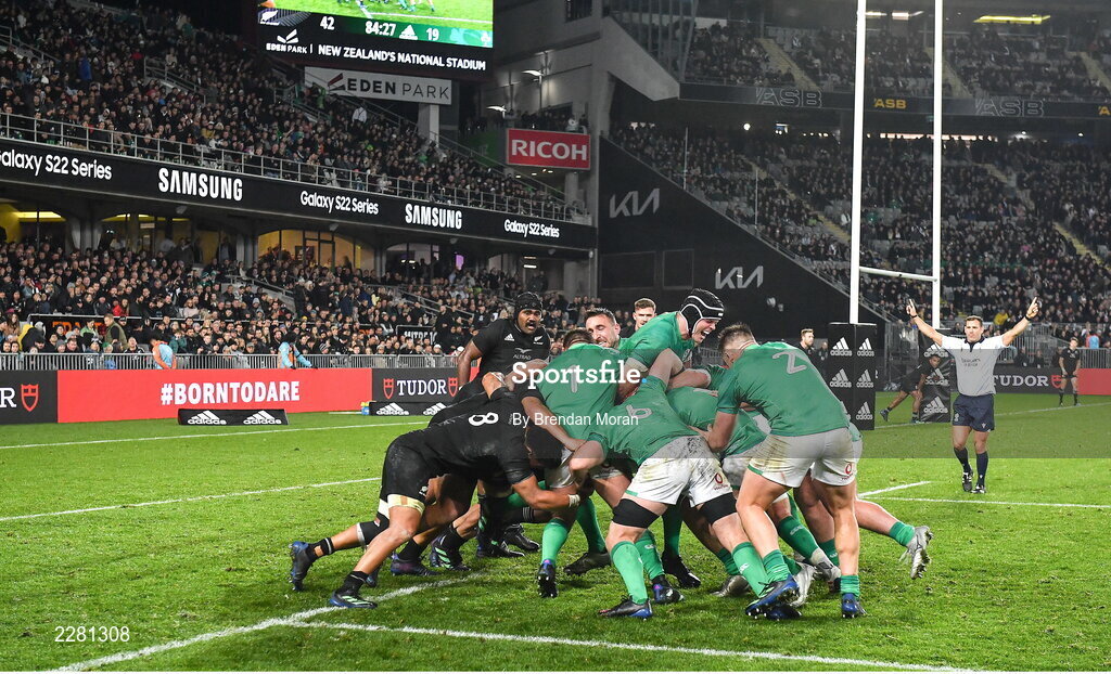 2 July 2022; The Ireland pack atempt to roll a maul towards the New Zealand try line during the Steinlager Series match between the New Zealand and Ireland at Eden Park in Auckland, New Zealand. Photo by Brendan Moran/Sportsfile