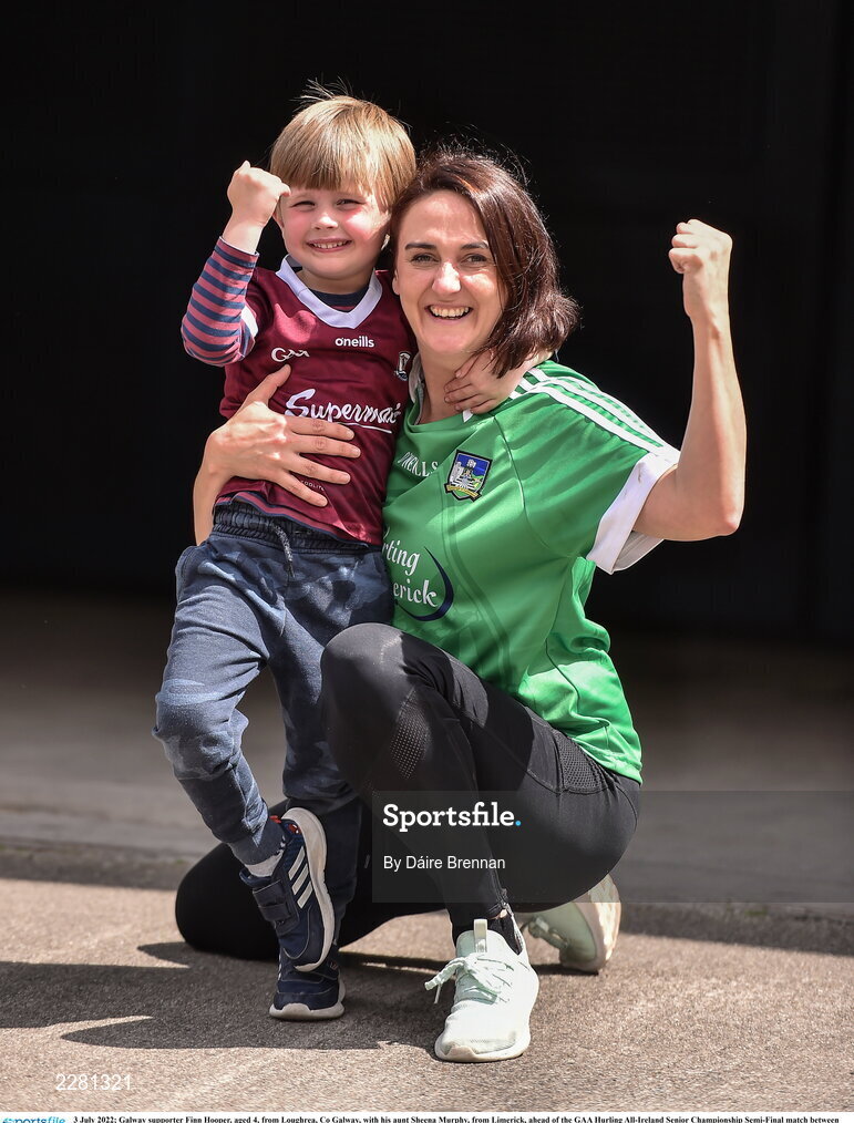 3 July 2022; Galway supporter Finn Hooper, aged 4, from Loughrea, Co Galway, with his aunt Sheena Murphy, from Limerick, ahead of the GAA Hurling All-Ireland Senior Championship Semi-Final match between Limerick and Galway at Croke Park in Dublin. Photo by Daire Brennan/Sportsfile
