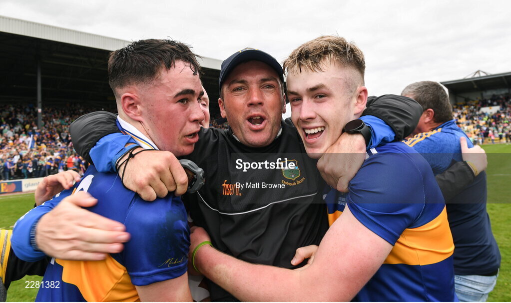 3 July 2022; Tipperary manager James Woodlock celebrates with Adam Daly, left, and Tadhg Sheehan after the Electric Ireland GAA Hurling All-Ireland Minor Championship Final match between Tipperary and Offaly at UPMC Nowlan Park, Kilkenny. Photo by Matt Browne/Sportsfile