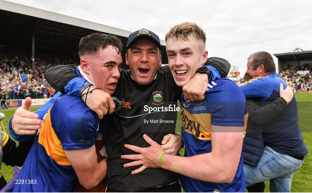 3 July 2022; Tipperary manager James Woodlock celebrates with Adam Daly, left, and Tadhg Sheehan after the Electric Ireland GAA Hurling All-Ireland Minor Championship Final match between Tipperary and Offaly at UPMC Nowlan Park, Kilkenny. Photo by Matt Browne/Sportsfile