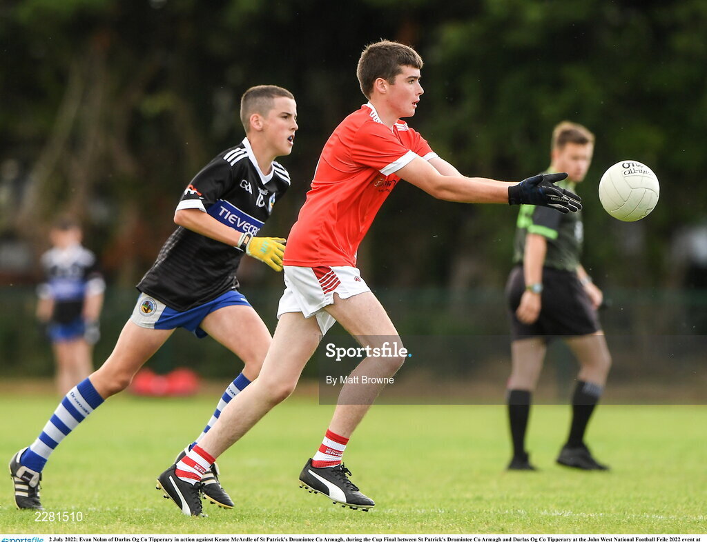2 July 2022; Evan Nolan of Durlas Og Co Tipperary in action against Keane McArdle of St Patrick's Dromintee Co Armagh, during the Cup Final between St Patrick's Dromintee Co Armagh and Durlas Og Co Tipperary at the John West National Football Feile 2022 event at Kildare GAA Centre in Hawkfield, Kildare. Photo by Matt Browne/Sportsfile
