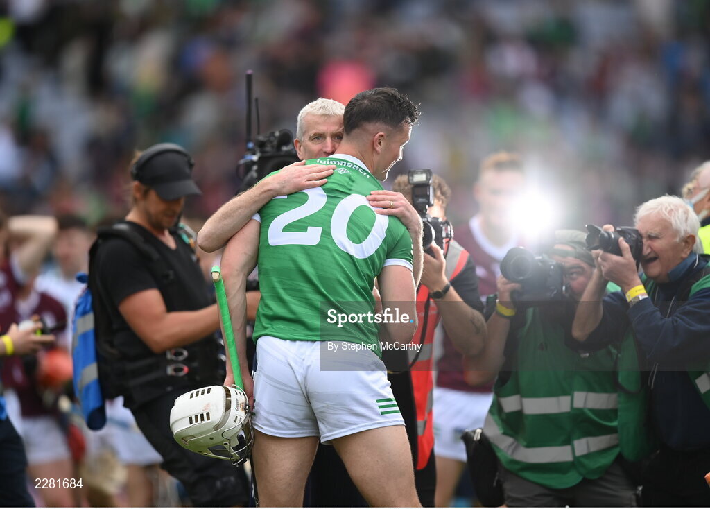 3 July 2022; Limerick manager John Kiely and Kyle Hayes celebrate after the GAA Hurling All-Ireland Senior Championship Semi-Final match between Limerick and Galway at Croke Park in Dublin. Photo by Stephen McCarthy/Sportsfile