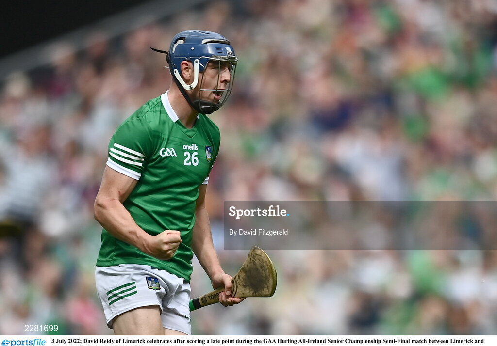 3 July 2022; David Reidy of Limerick celebrates after scoring a late point during the GAA Hurling All-Ireland Senior Championship Semi-Final match between Limerick and Galway at Croke Park in Dublin. Photo by David Fitzgerald/Sportsfile