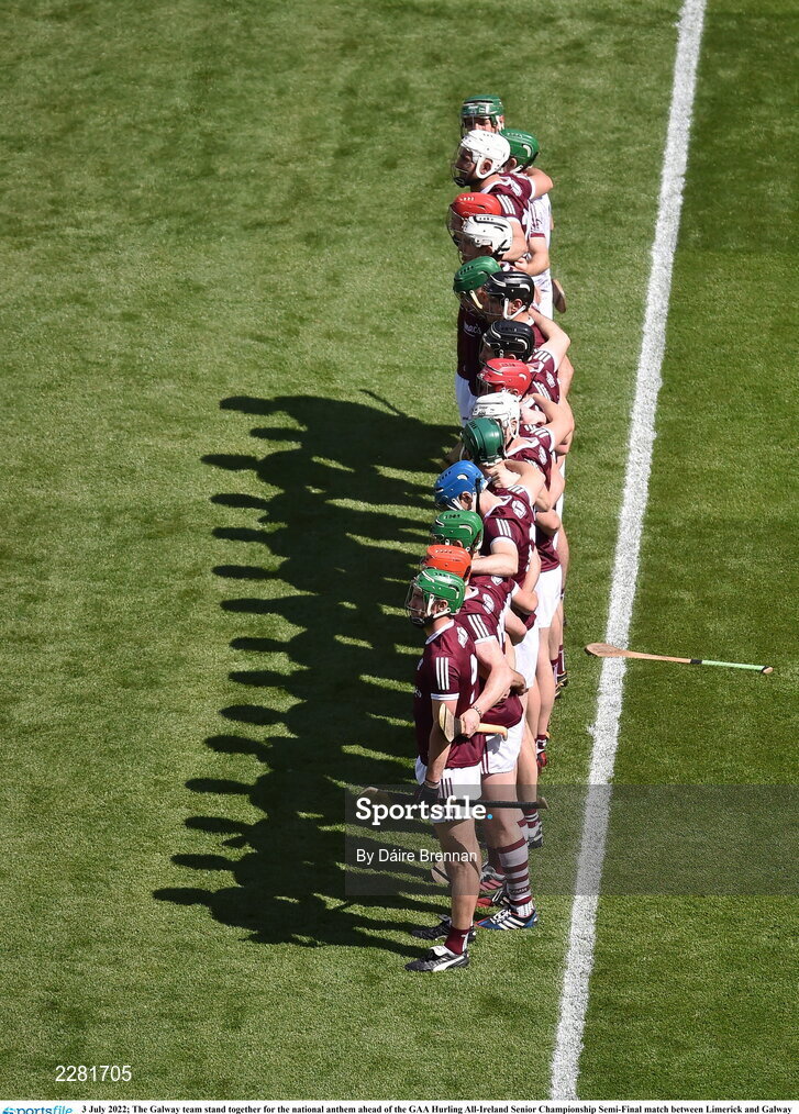 3 July 2022; The Galway team stand together for the national anthem ahead of the GAA Hurling All-Ireland Senior Championship Semi-Final match between Limerick and Galway at Croke Park in Dublin. Photo by Daire Brennan/Sportsfile