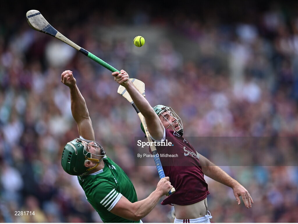 3 July 2022; Brian Concannon of Galway in action against Seán Finn of Limerick during the GAA Hurling All-Ireland Senior Championship Semi-Final match between Limerick and Galway at Croke Park in Dublin. Photo by Piaras Ó Mídheach/Sportsfile