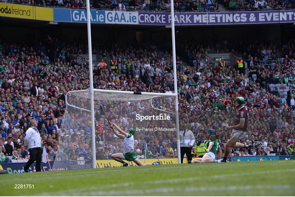 3 July 2022; Nickie Quaid of Limerick is beaten by a shot by Brian Concannon of Galway, right, for Galway's first goal during the GAA Hurling All-Ireland Senior Championship Semi-Final match between Limerick and Galway at Croke Park in Dublin. Photo by Piaras Ó Mídheach/Sportsfile