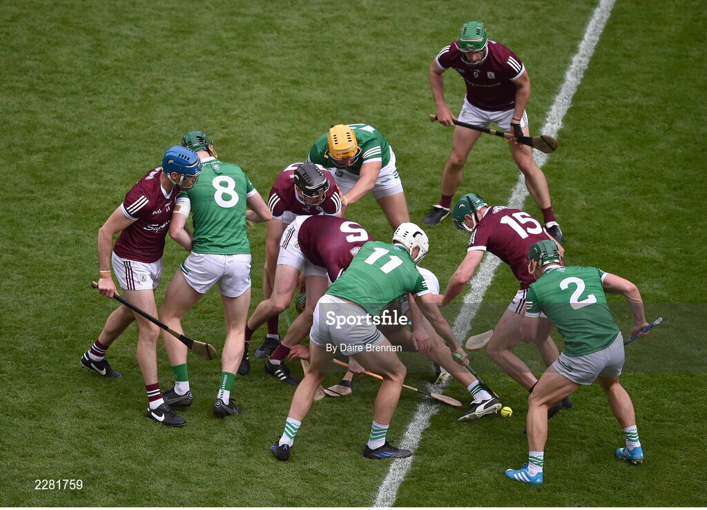 3 July 2022; Players from both sides battle for the ball during the GAA Hurling All-Ireland Senior Championship Semi-Final match between Limerick and Galway at Croke Park in Dublin. Photo by Daire Brennan/Sportsfile