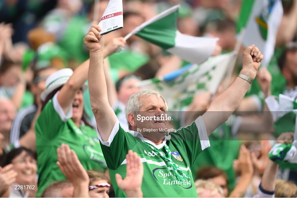 3 July 2022; Limerick supporter celebrate during the GAA Hurling All-Ireland Senior Championship Semi-Final match between Limerick and Galway at Croke Park in Dublin. Photo by Stephen McCarthy/Sportsfile