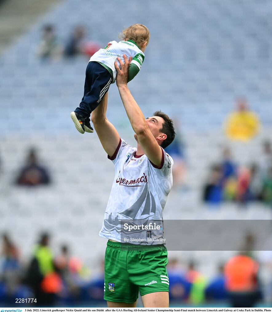 3 July 2022; Limerick goalkeeper Nickie Quaid and his son Dáithí after the GAA Hurling All-Ireland Senior Championship Semi-Final match between Limerick and Galway at Croke Park in Dublin. Photo by Stephen McCarthy/Sportsfile