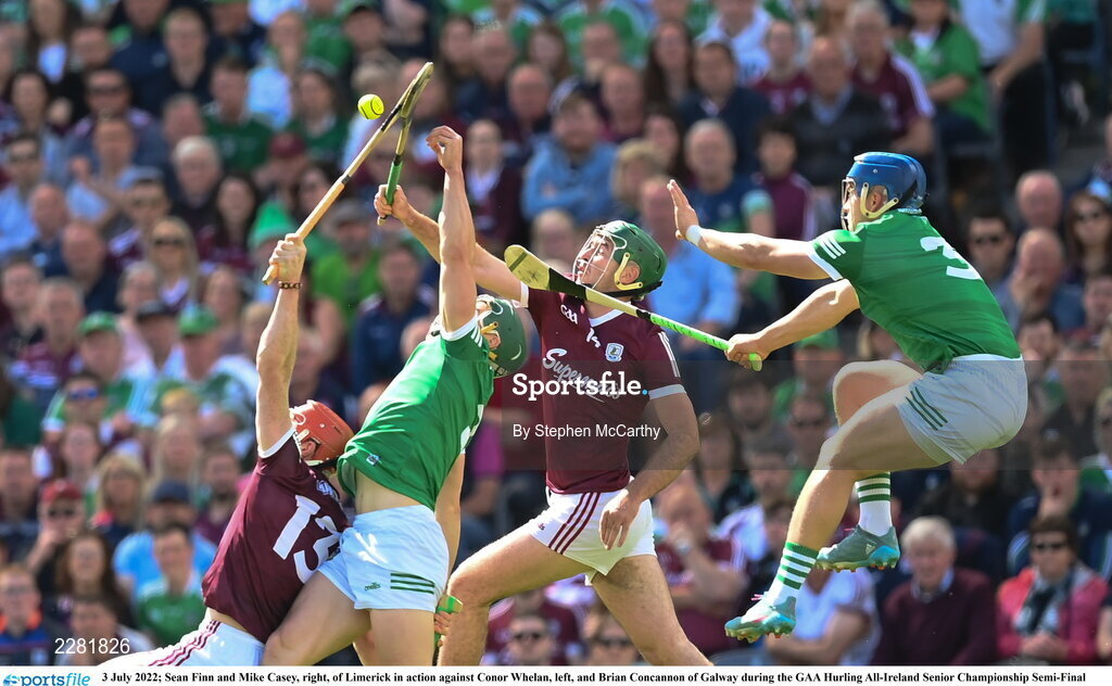 3 July 2022; Sean Finn and Mike Casey, right, of Limerick in action against Conor Whelan, left, and Brian Concannon of Galway during the GAA Hurling All-Ireland Senior Championship Semi-Final match between Limerick and Galway at Croke Park in Dublin. Photo by Stephen McCarthy/Sportsfile