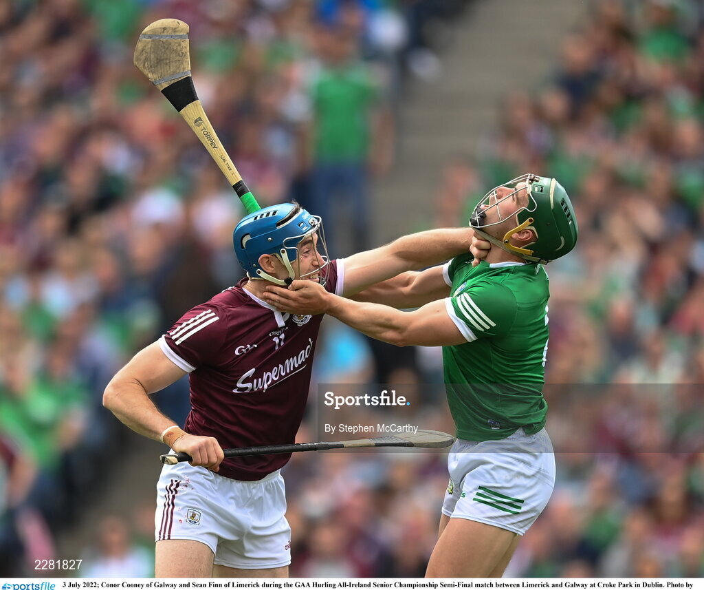 3 July 2022; Conor Cooney of Galway and Sean Finn of Limerick during the GAA Hurling All-Ireland Senior Championship Semi-Final match between Limerick and Galway at Croke Park in Dublin. Photo by Stephen McCarthy/Sportsfile