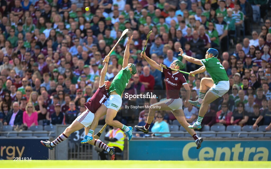 3 July 2022; Sean Finn and Mike Casey, right, of Limerick in action against Conor Whelan, left, and Brian Concannon of Galway during the GAA Hurling All-Ireland Senior Championship Semi-Final match between Limerick and Galway at Croke Park in Dublin. Photo by Stephen McCarthy/Sportsfile
