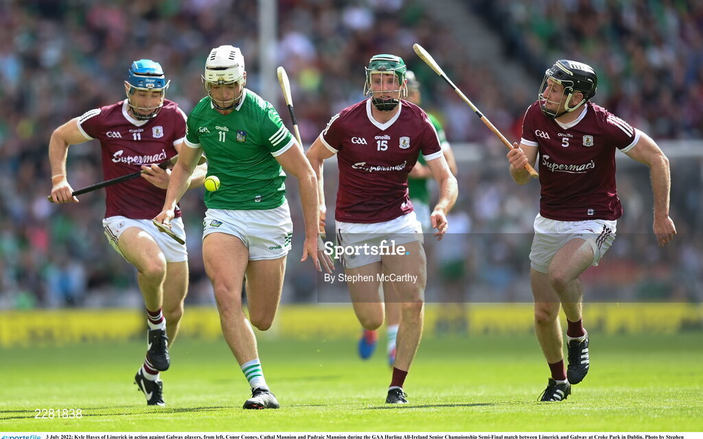 3 July 2022; Kyle Hayes of Limerick in action against Galway players, from left, Conor Cooney, Cathal Mannion and Padraic Mannion during the GAA Hurling All-Ireland Senior Championship Semi-Final match between Limerick and Galway at Croke Park in Dublin. Photo by Stephen McCarthy/Sportsfile