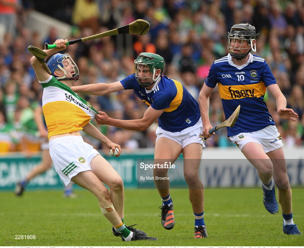 3 July 2022; Leigh Kavanagh of Offaly in action against Sam O'Farrell of Tipperary during the Electric Ireland GAA Hurling All-Ireland Minor Championship Final match between Tipperary and Offaly at UPMC Nowlan Park, Kilkenny. Photo by Matt Browne/Sportsfile