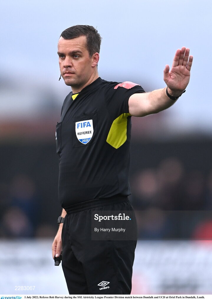 1 July 2022; Referee Rob Harvey during the SSE Airtricity League Premier Division match between Dundalk and UCD at Oriel Park in Dundalk, Louth. Photo by Harry Murphy/Sportsfile