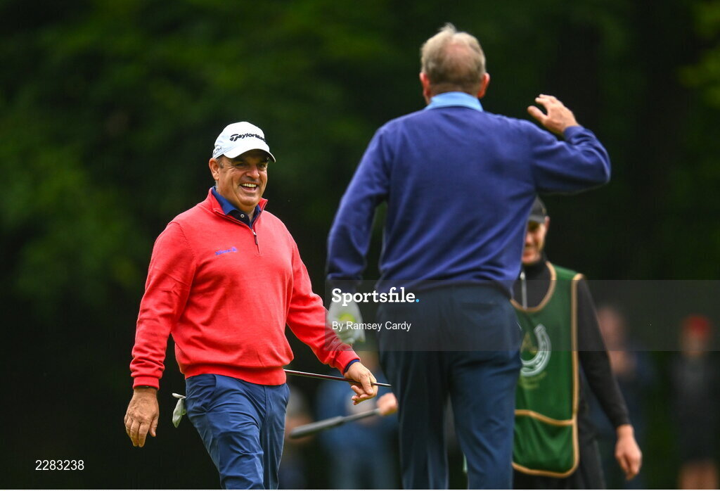 5 July 2022; Paul McGinley of Ireland and Brian Evans, right, during day two of the JP McManus Pro-Am at Adare Manor Golf Club in Adare, Limerick. Photo by Ramsey Cardy/Sportsfile