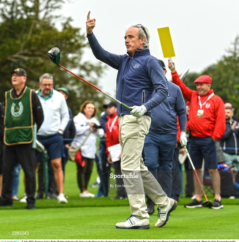 5 July 2022; Fromer jockey Ruby Walsh celebrates his drive on the first tee box during day two of the JP McManus Pro-Am at Adare Manor Golf Club in Adare, Limerick. Photo by Eóin Noonan/Sportsfile