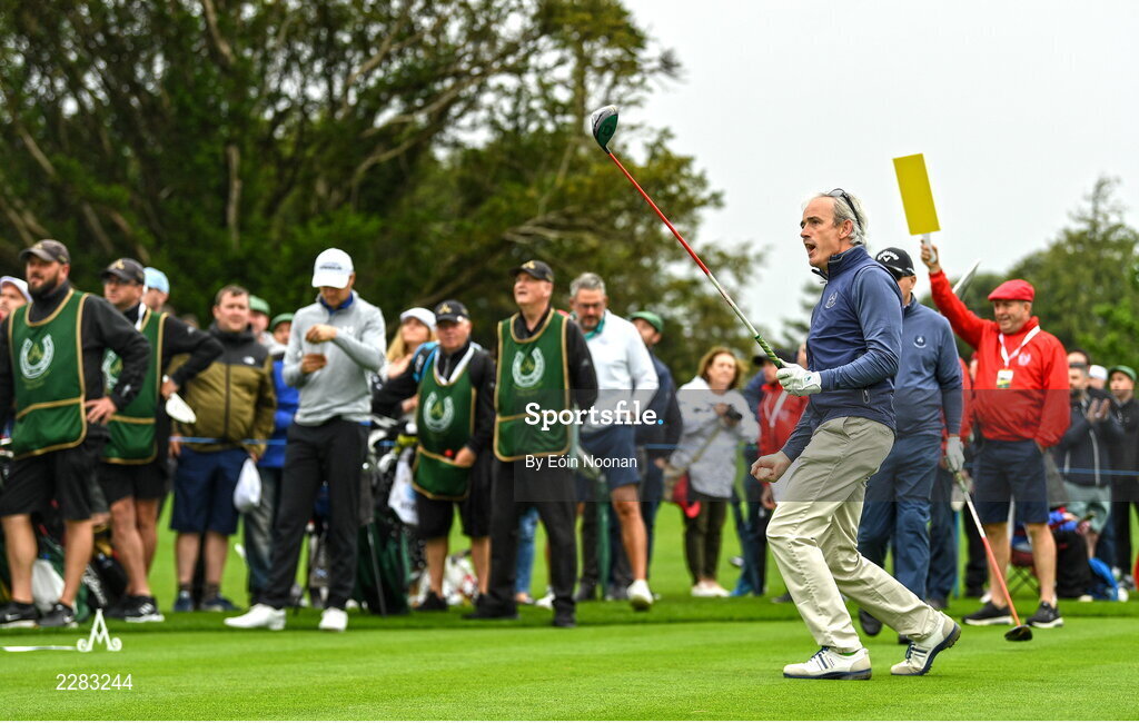 5 July 2022; Fromer jockey Ruby Walsh celebrates his drive on the first tee box during day two of the JP McManus Pro-Am at Adare Manor Golf Club in Adare, Limerick. Photo by Eóin Noonan/Sportsfile