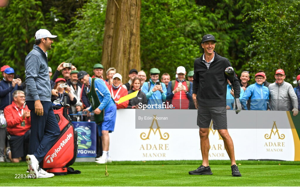 5 July 2022; Ted Scott, caddie to Scottie Scheffler of USA, prepares to tee off on the 14th tee box during day two of the JP McManus Pro-Am at Adare Manor Golf Club in Adare, Limerick. Photo by Eóin Noonan/Sportsfile