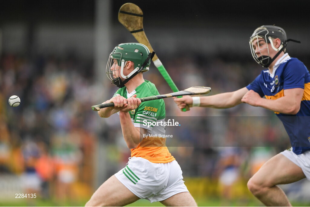 3 July 2022; Caelum Larkin of Offaly in action against Joe Egan of Tipperary during the Electric Ireland GAA Hurling All-Ireland Minor Championship Final match between Tipperary and Offaly at UPMC Nowlan Park, Kilkenny. Photo by Matt Browne/Sportsfile