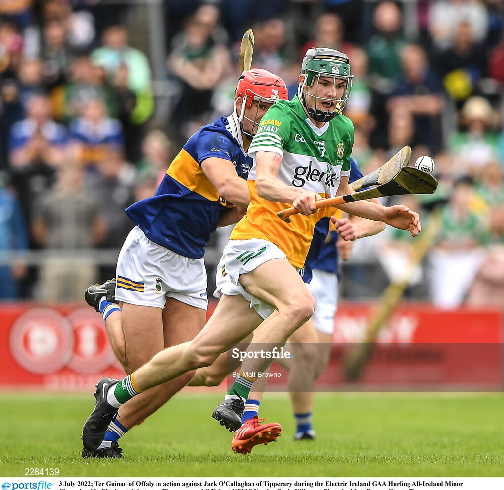 3 July 2022; Ter Guinan of Offaly in action against Jack O'Callaghan of Tipperary during the Electric Ireland GAA Hurling All-Ireland Minor Championship Final match between Tipperary and Offaly at UPMC Nowlan Park, Kilkenny. Photo by Matt Browne/Sportsfile