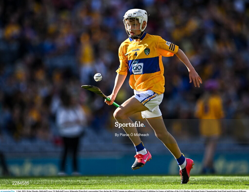 2 July 2022; Dylan Murphy, Ballyduff Lower NS Ballyduff Lower, Kilmeaden Waterford, representing Clare during the INTO Cumann na mBunscol GAA Respect Exhibition Go Games at half-time of the GAA Hurling All-Ireland Senior Championship Semi-Final match between Kilkenny and Clare at Croke Park in Dublin. Photo by Piaras Ó Mídheach/Sportsfile