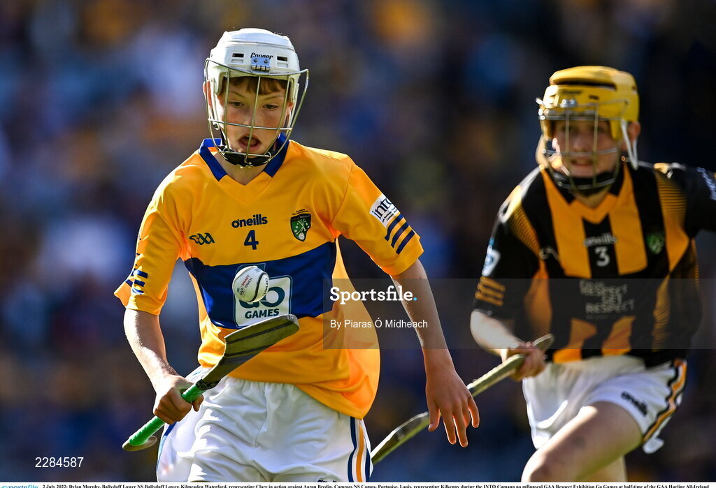 2 July 2022; Dylan Murphy, Ballyduff Lower NS Ballyduff Lower, Kilmeaden Waterford, representing Clare in action against Aaron Bredin, Camross NS Camos, Portaoise, Laois, representing Kilkenny during the INTO Cumann na mBunscol GAA Respect Exhibition Go Games at half-time of the GAA Hurling All-Ireland Senior Championship Semi-Final match between Kilkenny and Clare at Croke Park in Dublin. Photo by Piaras Ó Mídheach/Sportsfile