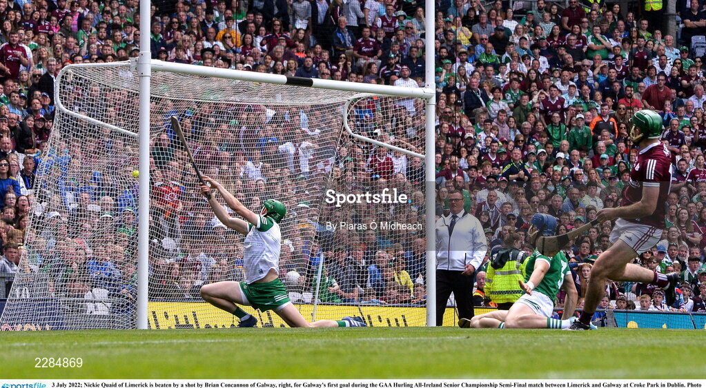 3 July 2022; Nickie Quaid of Limerick is beaten by a shot by Brian Concannon of Galway, right, for Galway's first goal during the GAA Hurling All-Ireland Senior Championship Semi-Final match between Limerick and Galway at Croke Park in Dublin. Photo by Piaras Ó Mídheach/Sportsfile