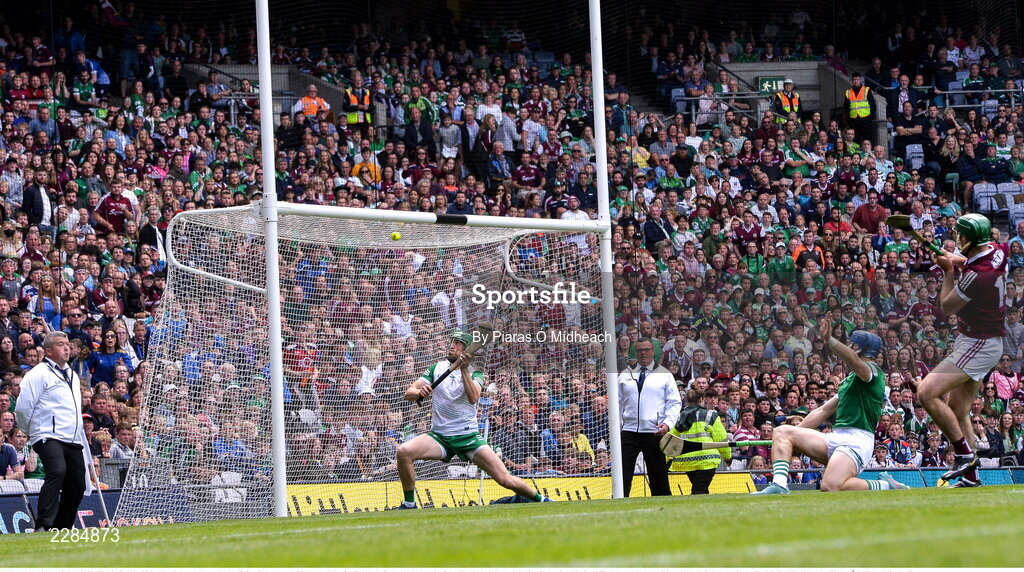3 July 2022; Nickie Quaid of Limerick is beaten by a shot by Brian Concannon of Galway, right, for Galway's first goal during the GAA Hurling All-Ireland Senior Championship Semi-Final match between Limerick and Galway at Croke Park in Dublin. Photo by Piaras Ó Mídheach/Sportsfile