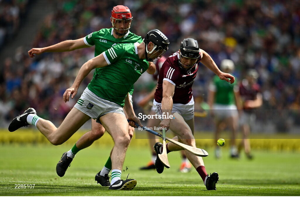 3 July 2022; Joseph Cooney of Galway in action against Diarmaid Byrnes, right, and Barry Nash of Limerick during the GAA Hurling All-Ireland Senior Championship Semi-Final match between Limerick and Galway at Croke Park in Dublin. Photo by Sam Barnes/Sportsfile