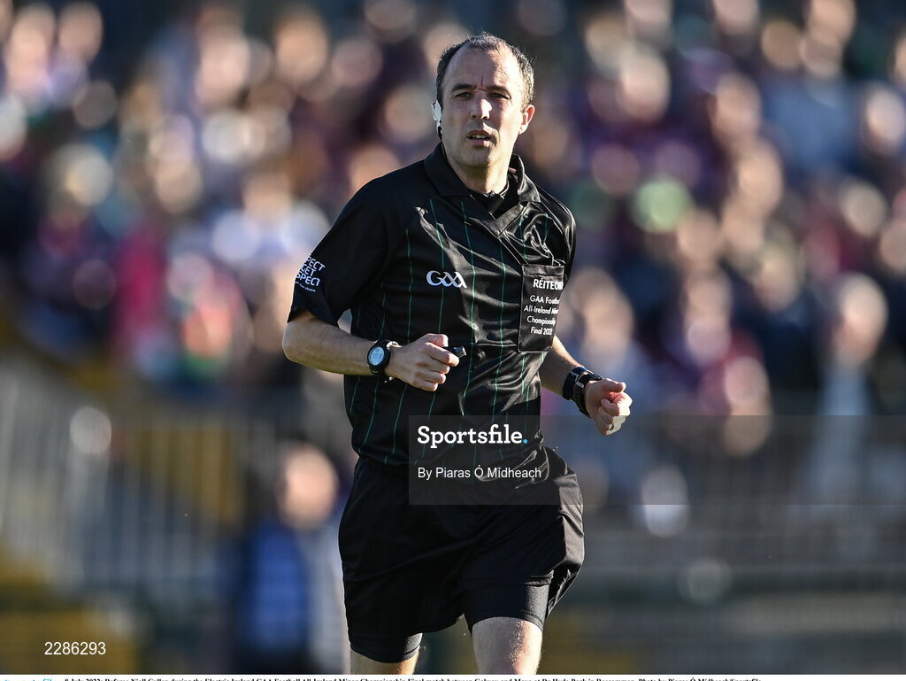 8 July 2022; Referee Niall Cullen during the Electric Ireland GAA Football All-Ireland Minor Championship Final match between Galway and Mayo at Dr Hyde Park in Roscommon. Photo by Piaras Ó Mídheach/Sportsfile