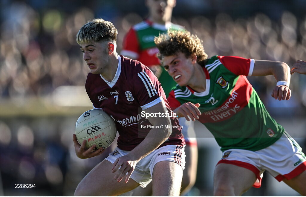8 July 2022; Ross Coen of Galway in action against Diarmuid Duffy of Mayo during the Electric Ireland GAA Football All-Ireland Minor Championship Final match between Galway and Mayo at Dr Hyde Park in Roscommon. Photo by Piaras Ó Mídheach/Sportsfile