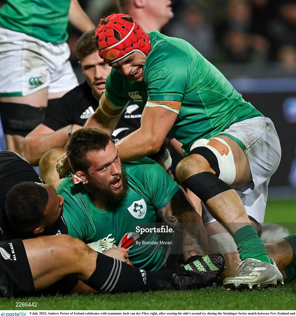 9 July 2022; Andrew Porter of Ireland celebrates with teammate Josh van der Flier, right, after scoring his side's second try during the Steinlager Series match between New Zealand and Ireland at the Forsyth Barr Stadium in Dunedin, New Zealand. Photo by Brendan Moran/Sportsfile