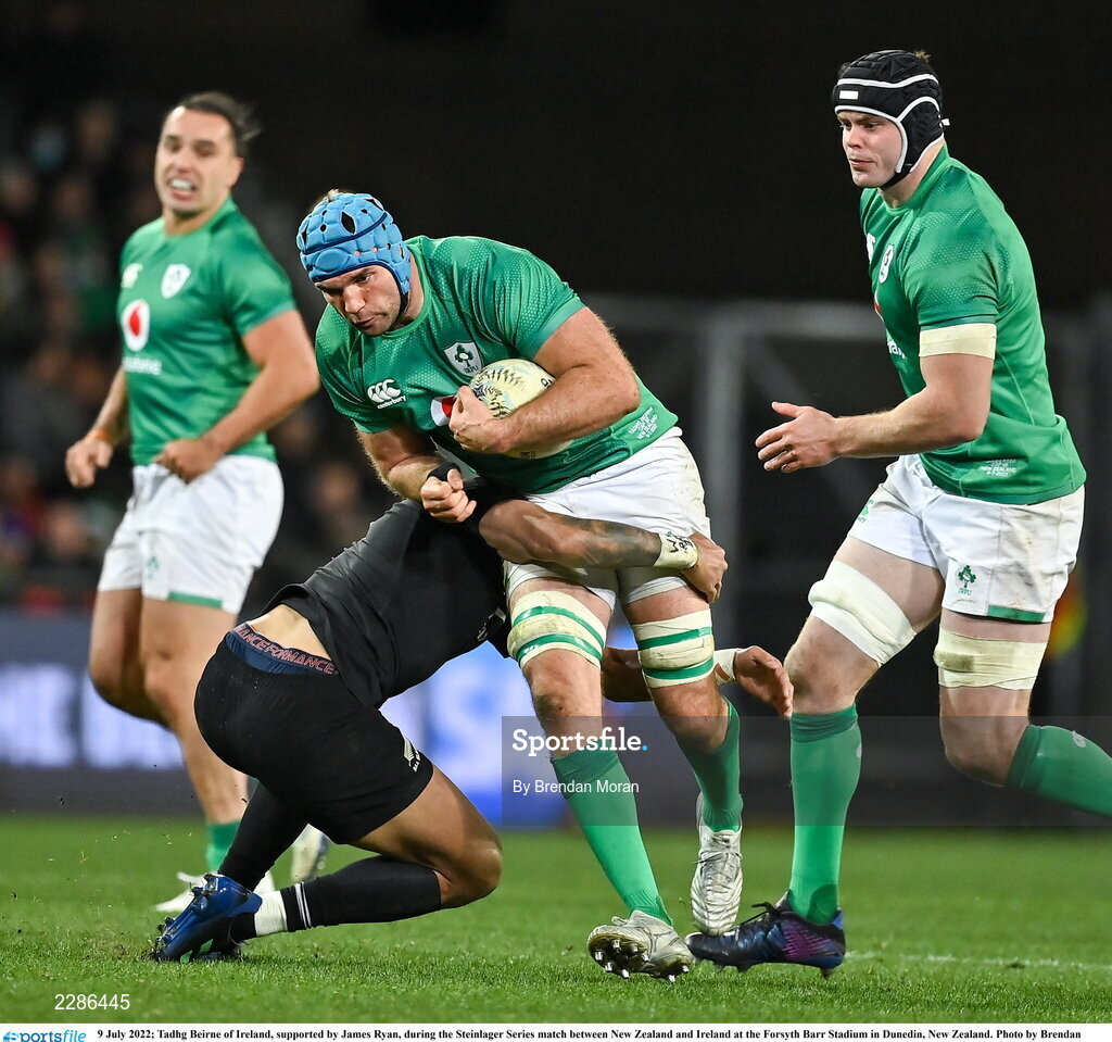 9 July 2022; Tadhg Beirne of Ireland, supported by James Ryan, during the Steinlager Series match between New Zealand and Ireland at the Forsyth Barr Stadium in Dunedin, New Zealand. Photo by Brendan Moran/Sportsfile