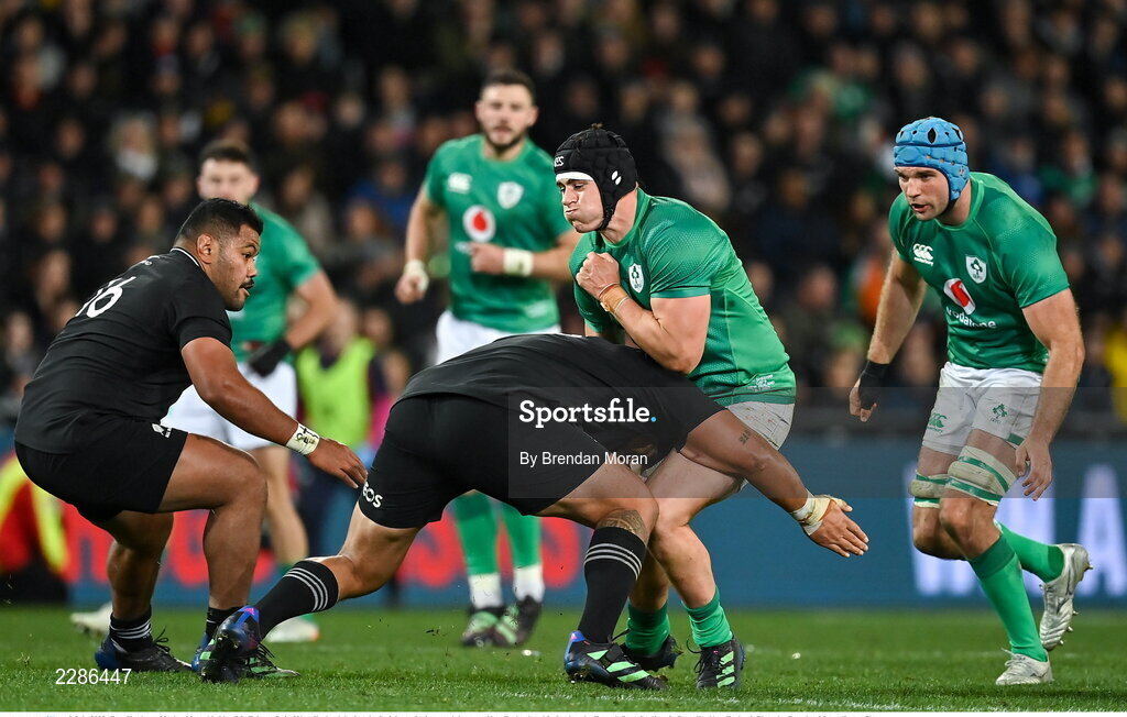 9 July 2022; Dan Sheehan of Ireland is tackled by Ofa Tu'ungafasi of New Zealand during the Steinlager Series match between New Zealand and Ireland at the Forsyth Barr Stadium in Dunedin, New Zealand. Photo by Brendan Moran/Sportsfile